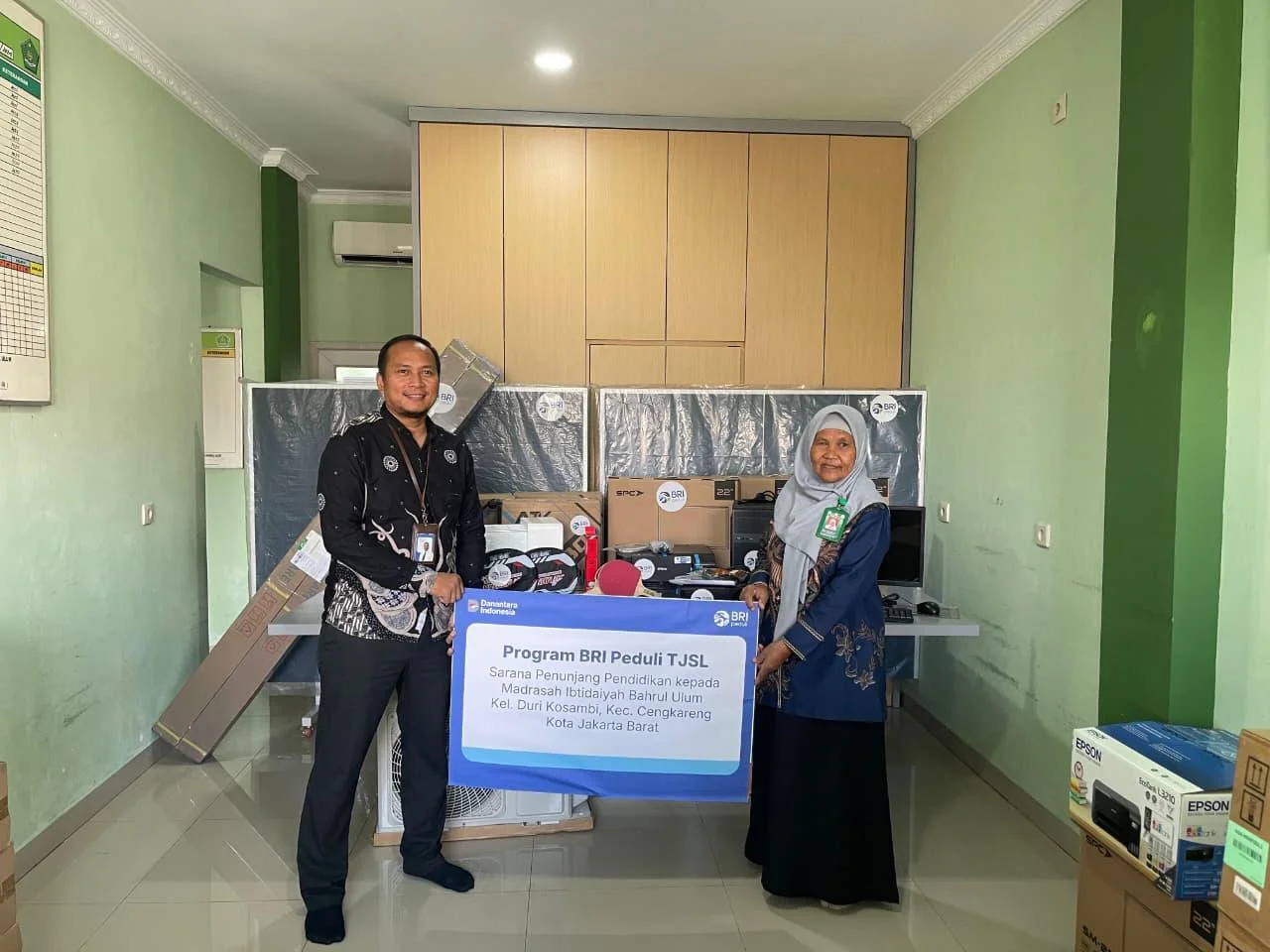 Jakarta – Sebagai wujud komitmen dalam mendukung peningkatan kualitas pendidikan, Bank Rakyat Indonesia melalui program BRI Peduli TJSL (Tanggung Jawab Sosial dan Lingkungan) menyalurkan bantuan sarana penunjang pendidikan kepada Madrasah Ibtidaiyah (MI) Bahrul Ulum yang berlokasi di Kelurahan Duri Kosambi, Kecamatan Cengkareng, Jakarta Barat.